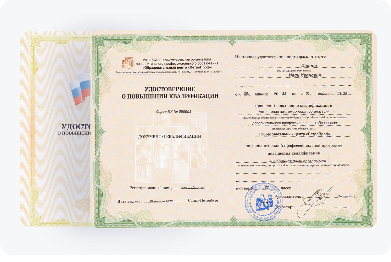 Учебный центр «ПетроПроф» обладает всеми необходимыми лицензиями и аккредитациями, поэтому мы официально гарантируем высокое качество образовательных услуг и полное соответствие требованиям гос.стандартов. Получив диплом нашего учреждения, вы сможете уверенно применять полученные знания на практике и успешно продвигаться по карьерной лестнице.